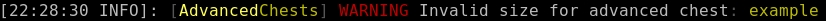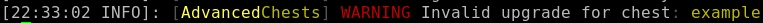 When an error in config is committed the chest file will not load properly. Because of this it is recommendable to check the console after editing the config and doing the respective reload. All the errors you have inside the chest folder will appear as a WARNING message. Here are some examples: